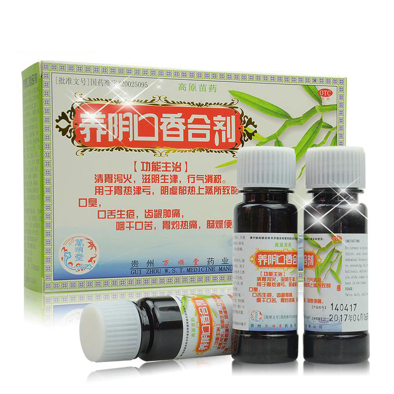 養(yǎng)陰口香合劑,苗醫(yī): 汗渥曲勒,旭嘎怡滇內(nèi),洛項(xiàng),來(lái)羅拉米,干郎比歐溜,勞力宮,蒙丟。中醫(yī):清胃瀉火,滋陰生津,行氣消積。用于胃熱津虧,陰虛郁熱上蒸所致的口臭,口舌生瘡,齒齦腫痛,咽干口苦,胃灼熱痛,腸燥便秘。
